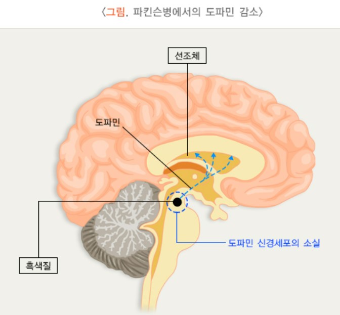 파킨슨병은 중추신경계의 퇴행성 질환 중 하나로, 뇌 속에 있는 도파민 신경세포가 점점 사라지면서 생기는 질환이에요.